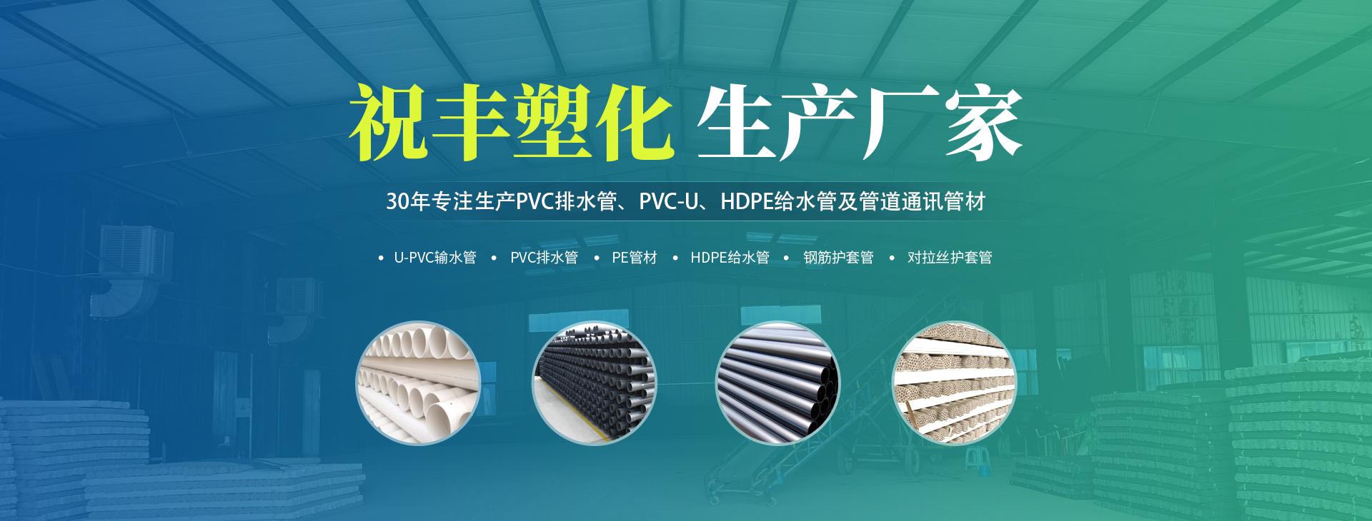 安陽(yáng)市祝豐塑化有限公司坐落在滑縣工業(yè)園區(qū),東臨大廣高速,西臨京珠高速,是鄭州、鶴壁、安陽(yáng)、濮陽(yáng)四個(gè)城市的輸紐,交通便利、環(huán)境優(yōu)美。       公司始建于八十年代,經(jīng)過(guò)二十余年的艱辛創(chuàng)業(yè),規(guī)模不斷壯大,由十多萬(wàn)元資產(chǎn)的小廠,發(fā)展到現(xiàn)占地面積達(dá)一萬(wàn)多平,建筑面積一萬(wàn)平,資產(chǎn)2000多萬(wàn)元管材生產(chǎn)企業(yè)。公司生產(chǎn)PVC-U、PVC排水管、HDPE給水管、鋼筋護(hù)套管管道通訊管材等產(chǎn)品,廣泛用于農(nóng)田節(jié)水、高山引水、人畜用水、建筑、電力通訊等多種用途,品種齊全。為了滿(mǎn)足用戶(hù)需求,可承攬各種給水、節(jié)水、灌溉工程。“祝豐塑化”憑借強(qiáng)勁的實(shí)力,優(yōu)良的管理水平。“以質(zhì)量求生存,以信譽(yù)求發(fā)展”的原則全力以赴和大家共同塑造美好未來(lái)。..